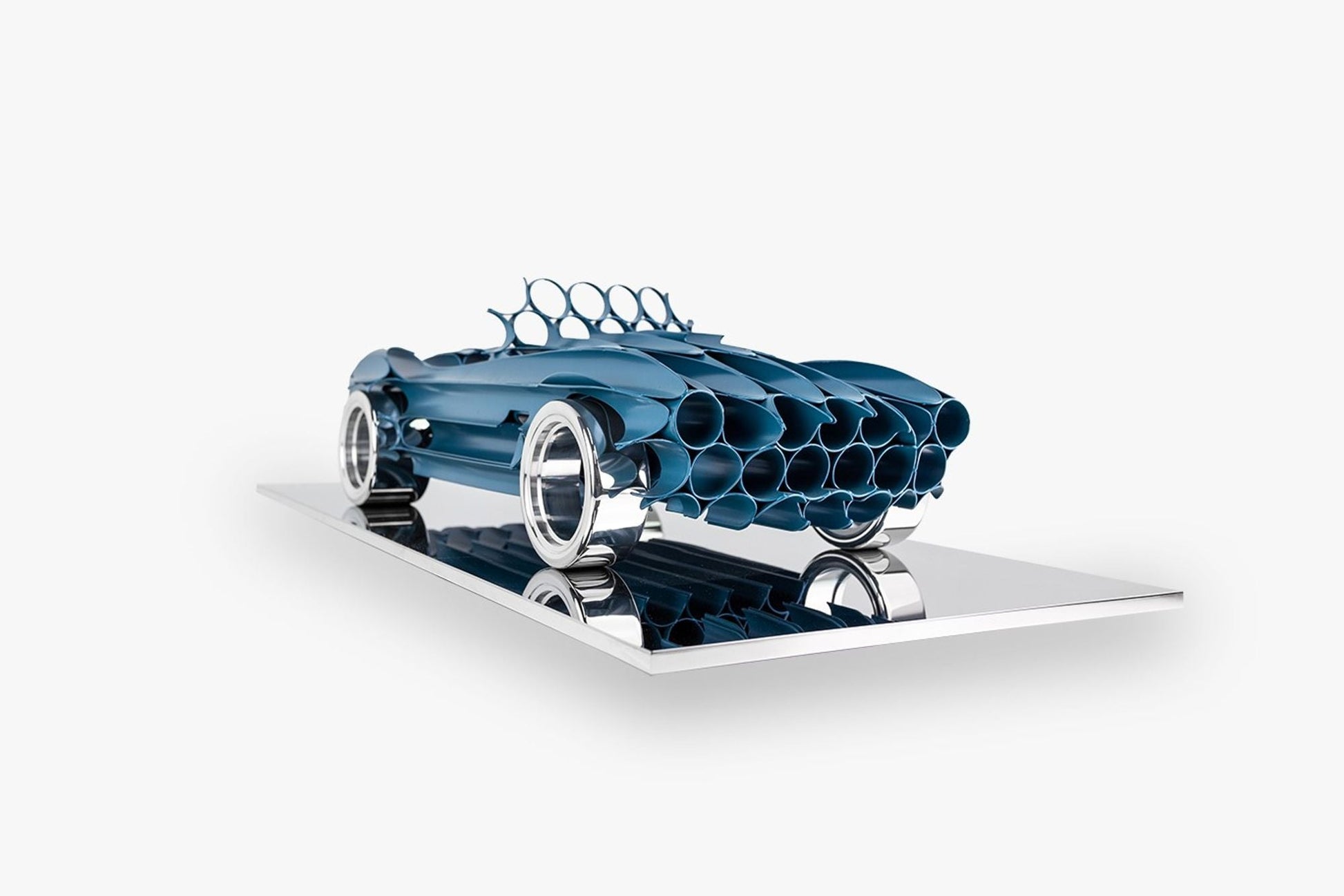 Base and wheels in polished solid aluminium | Fuselage in blue painted stainless steel tubes | Edition of 8 + 4 AP