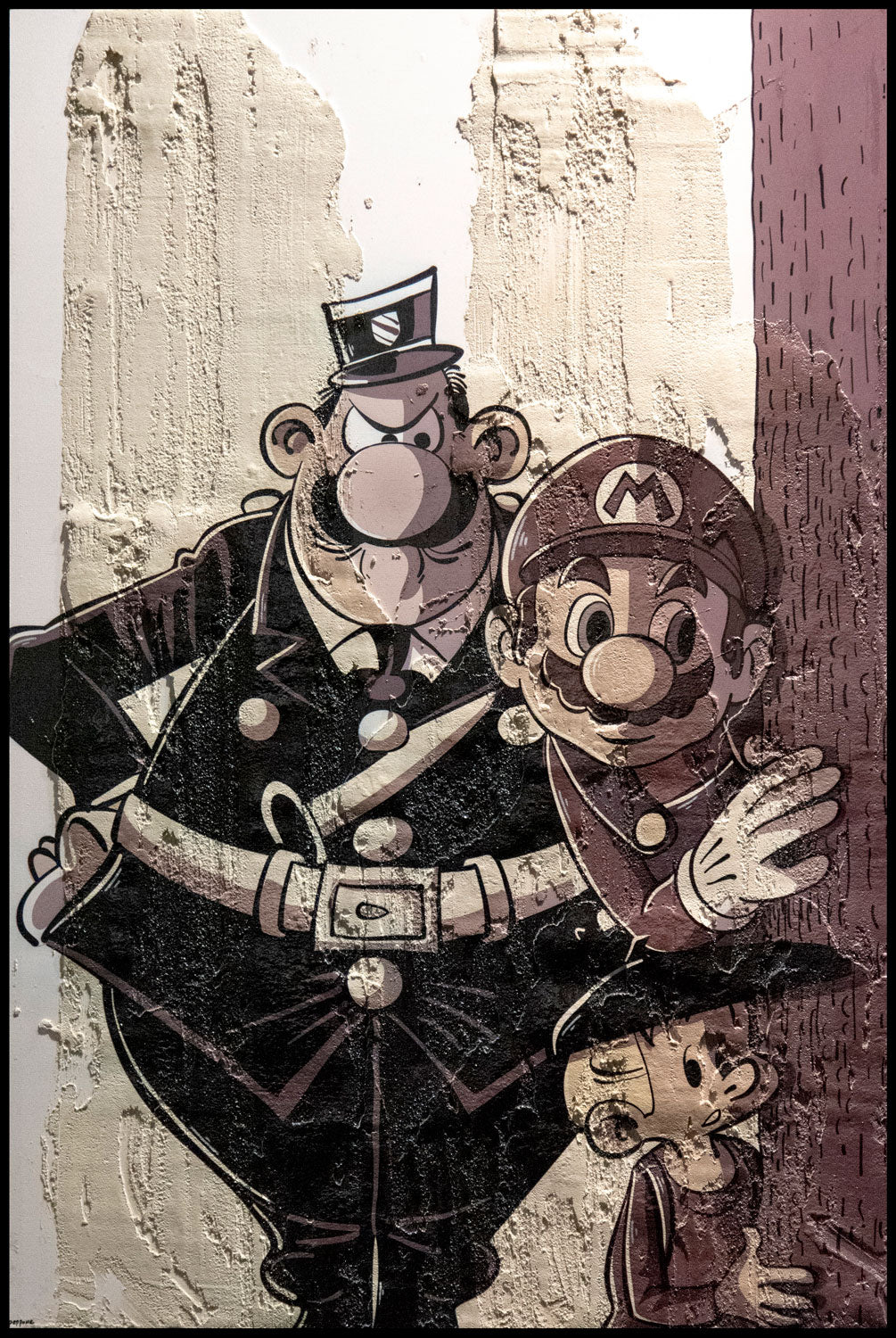 Cemented plaster on canvas mounted on dibond, ink, spray painting and paint marker | Framed in recycled wood American box.