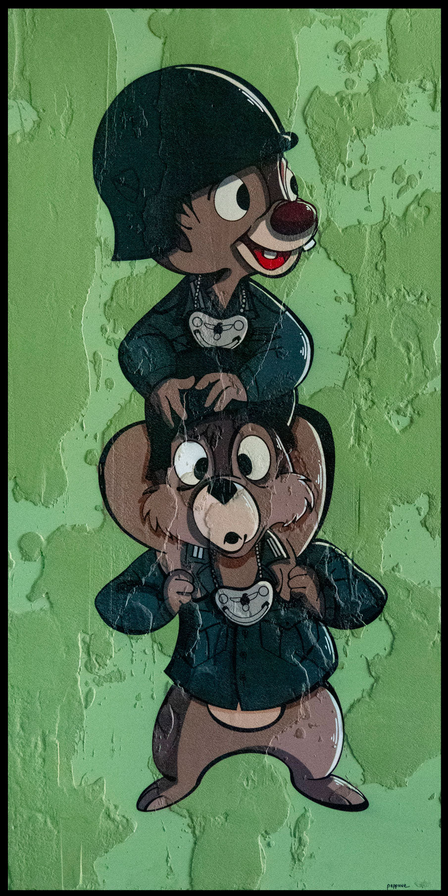 Cemented plaster on canvas mounted on dibond, ink, spray painting and paint marker | Framed in recycled wood American box.